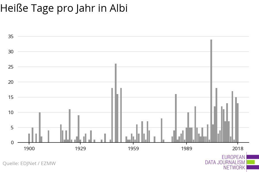 Mit Hilfe der Daten des Europäischen Zentrums für mittelfristige Wettervorhersage (European Centre for Medium-Range Weather Forecasts) haben wir 118 Jahre Wetterdaten in und um die Stadt Albi analysiert. Das untersuchte Gebiet umfasst auch die Umgebung von Albi, zu der auch Berge oder Gewässer gehören können, so dass die hier gezeigten Temperaturen nicht genau den von den Wetterstationen von Albi erfassten Temperaturen entsprechen (siehe Methodik für Details). Das haben wir herausgefunden: