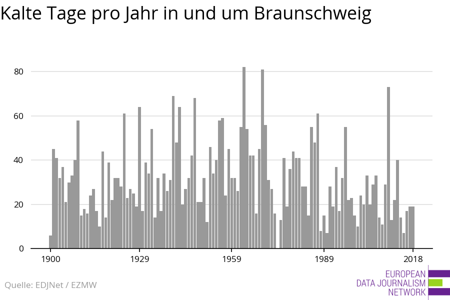 Mit Hilfe der Daten des Europäischen Zentrums für mittelfristige Wettervorhersage (European Centre for Medium-Range Weather Forecasts) haben wir 118 Jahre Wetterdaten in und um die Stadt Braunschweig analysiert. Das untersuchte Gebiet umfasst auch die Umgebung von Braunschweig, zu der auch Berge oder Gewässer gehören können, so dass die hier gezeigten Temperaturen nicht genau den von den Wetterstationen von Braunschweig erfassten Temperaturen entsprechen (siehe Methodik für Details). Das haben wir herausgefunden: