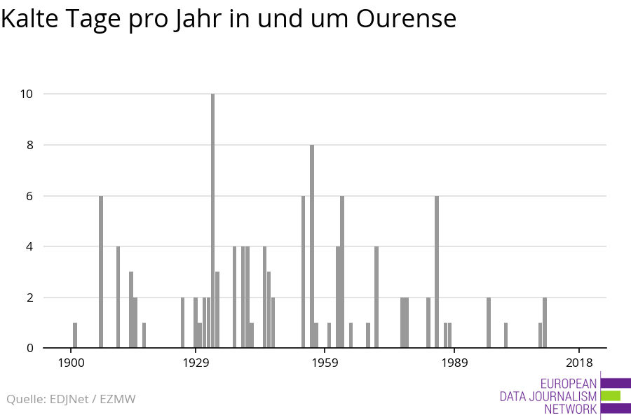 Mit Hilfe der Daten des Europäischen Zentrums für mittelfristige Wettervorhersage (European Centre for Medium-Range Weather Forecasts) haben wir 118 Jahre Wetterdaten in und um die Stadt Ourense analysiert. Das untersuchte Gebiet umfasst auch die Umgebung von Ourense, zu der auch Berge oder Gewässer gehören können, so dass die hier gezeigten Temperaturen nicht genau den von den Wetterstationen von Ourense erfassten Temperaturen entsprechen (siehe Methodik für Details). Das haben wir herausgefunden: