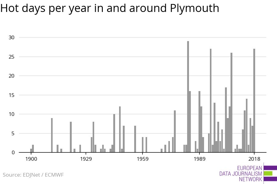 Using data from the European Centre for Medium-Range Weather Forecasts, we analysed 118 years of weather data in and around the city of Plymouth. The area analysed also includes the surroundings of Plymouth, which might include mountains or bodies of water, so that the temperatures shown here do not correspond exactly to the temperatures recorded by the weather stations of Plymouth (see Methodology for details). This is what we found: