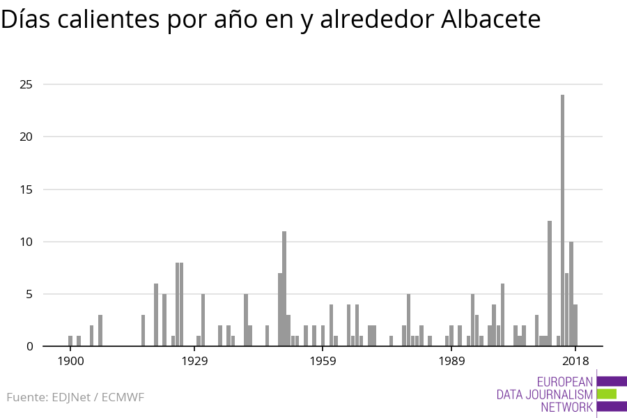 Utilizando datos del Centro Europeo para Pronósticos Meteorológicos de Medio Alcance, analizamos 118 años de datos meteorológicos en la ciudad de Albacete y sus alrededores. El área bajo investigación también incluye los alrededores de Albacete, que pueden incluir montañas o áreas acuáticas, de modo que las temperaturas aquí mostradas no corresponden exactamente a las temperaturas registradas por las estaciones meteorológicas de Albacete (ver Metodología para más detalles). Esto es lo que encontramos: