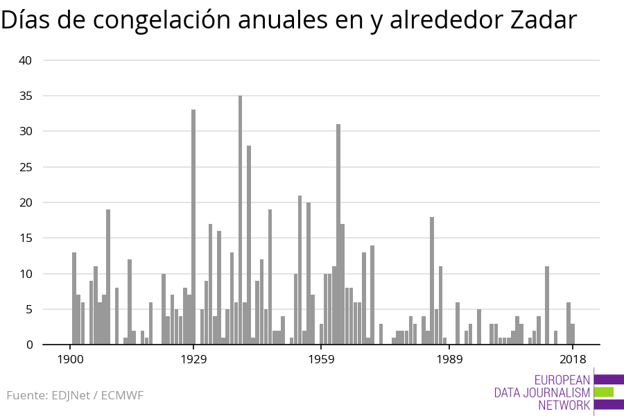 Utilizando datos del Centro Europeo para Pronósticos Meteorológicos de Medio Alcance, analizamos 118 años de datos meteorológicos en la ciudad de Zadar y sus alrededores. El área bajo investigación también incluye los alrededores de Zadar, que pueden incluir montañas o áreas acuáticas, de modo que las temperaturas aquí mostradas no corresponden exactamente a las temperaturas registradas por las estaciones meteorológicas de Zadar (ver Metodología para más detalles). Esto es lo que encontramos:
