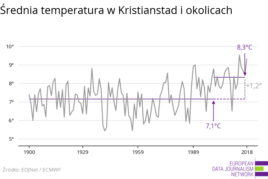 Temperatura Kristianstad i okolicach pomiędzy 2000 rokiem a 2018 była 1,2°C powyżej średniej z XX w.