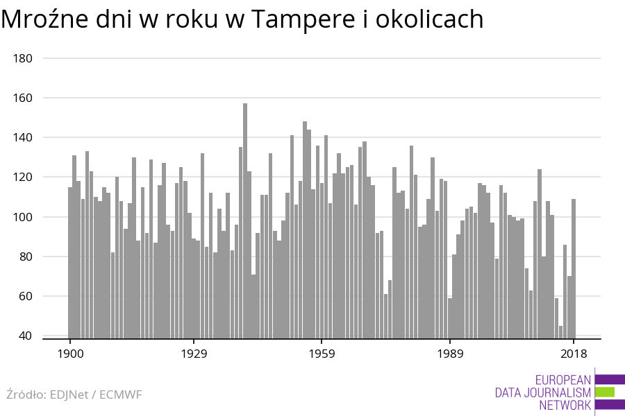 W oparciu o dane z Europejskiego Centrum Prognoza Średnioterminowych przeanalizowaliśmy pogodę w ciągu 118 lat Tampere i okolicach. Obszar który poddaliśmy badaniu obejmuje również okolice Tampere, gdzie występować mogą góry oraz akweny wodne i dlatego temperatury tutaj wskazane nie pokrywają się z temperaturami podawanymi przez stacje meteoroligiczne Tampere (sprawdź szczegóły: Metologia). Oto co odkryliśmy: