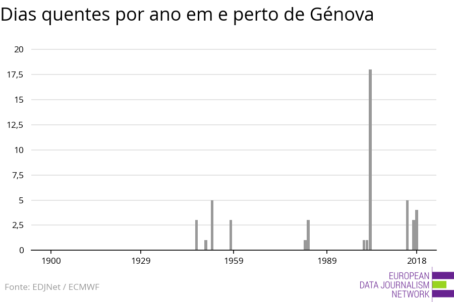 Através de dados do Centro Europeu de Previsões Meteorológicas a Médio Prazo, analisámos 118 anos de dados meteorológicos em Génova e arredores. A área sob investigação também inclui os arredores de Génova, que podem incluir montanhas ou extensões de água. Deste modo, as temperaturas aqui apresentadas não correspondem exatamente às temperaturas registadas pelas estações meteorológicas de Génova (ver Metodologia para obter detalhes). Eis o que verificámos: