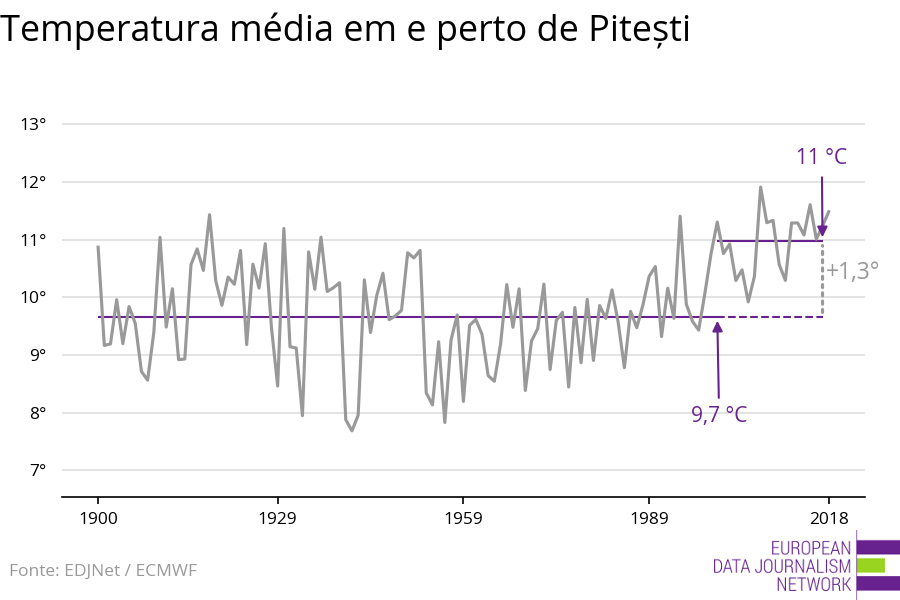Através de dados do Centro Europeu de Previsões Meteorológicas a Médio Prazo, analisámos 118 anos de dados meteorológicos em Pitești e arredores. A área sob investigação também inclui os arredores de Pitești, que podem incluir montanhas ou extensões de água. Deste modo, as temperaturas aqui apresentadas não correspondem exatamente às temperaturas registadas pelas estações meteorológicas de Pitești (ver Metodologia para obter detalhes). Eis o que verificámos: