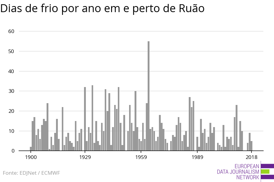 Através de dados do Centro Europeu de Previsões Meteorológicas a Médio Prazo, analisámos 118 anos de dados meteorológicos em Ruão e arredores. A área sob investigação também inclui os arredores de Ruão, que podem incluir montanhas ou extensões de água. Deste modo, as temperaturas aqui apresentadas não correspondem exatamente às temperaturas registadas pelas estações meteorológicas de Ruão (ver Metodologia para obter detalhes). Eis o que verificámos: