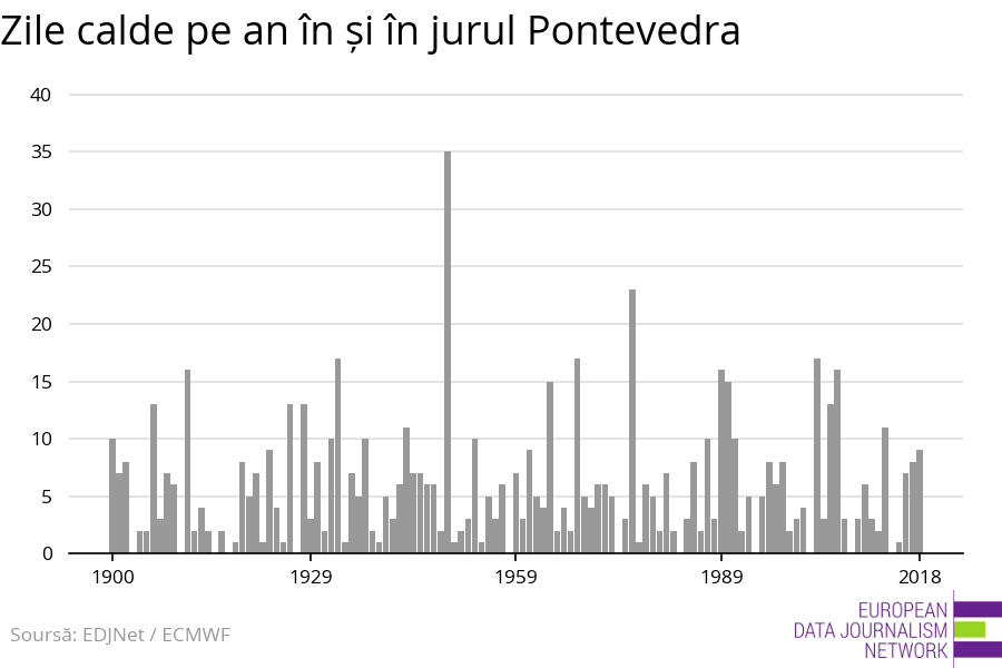 Folosind date de la Centrul European pentru prognoza meteo pe termen mediu, am analizat 118 ani de date meteorologice în și în jurul orașului Pontevedra. Zona investigată include, de asemenea, împrejurimile orașului, care ar putea include munți sau corpuri de apă, astfel încât temperaturile afișate aici să nu corespundă exact cu temperaturile înregistrate de stațiile meteorologice ale Pontevedra (a se vedea Metodologia pentru detalii). Iată ceea ce am găsit: