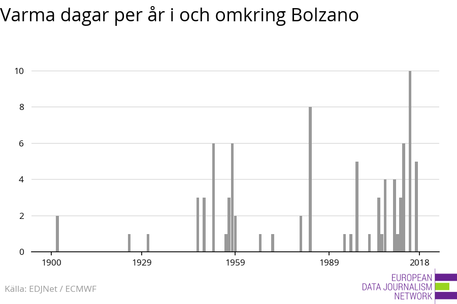 Temperaturen i trakten av Bolzano mellan 2000 och 2018 var 0,9°C över genomsnittet för 1900-talet.
