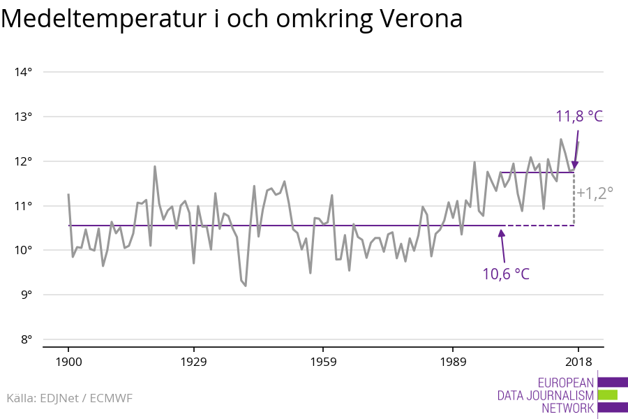Temperaturen i trakten av Verona mellan 2000 och 2018 var 1,2°C över genomsnittet för 1900-talet.